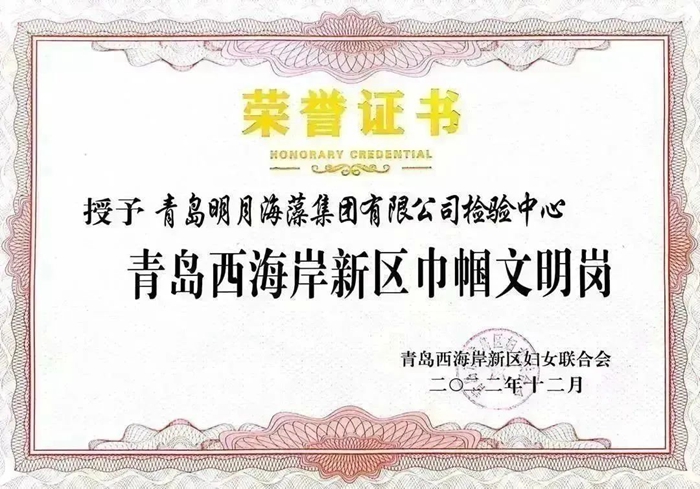 日前,青島明月海藻集團(tuán)檢驗(yàn)中心被區(qū)婦聯(lián)授予“巾幗文明崗”榮譽(yù)稱號(hào)。