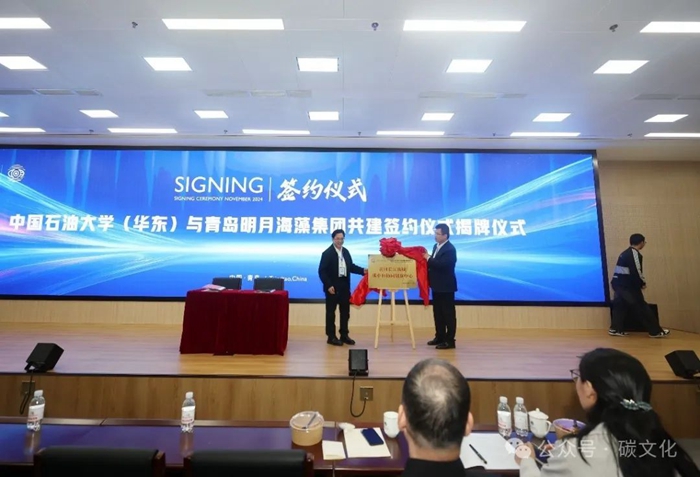 協(xié)議包括三位一體協(xié)同創(chuàng)新中心建設(shè)(機(jī)構(gòu)建設(shè)、海洋碳匯教育、海洋碳匯科技和海洋碳匯人才建設(shè))及碳文化科普館建設(shè)兩大主要內(nèi)容,合同期三年,合作經(jīng)費(fèi)300萬元,主要基于明月海藻展館進(jìn)行海洋碳匯教育,接收學(xué)生研學(xué),并成立講解團(tuán),讓講解團(tuán)員在“講中學(xué)、學(xué)中講”;面向?qū)W生設(shè)立海洋碳匯科研項目,鼓勵學(xué)校教師參與公司科研研發(fā)和校企共同申請?zhí)紖R科技項目;建立海洋碳匯人才庫,并對優(yōu)秀人才給予一定的獎勵;在校內(nèi)建立“碳文化館”,并由校企雙方選派指導(dǎo)教師,利用碳文化相關(guān)課程進(jìn)行科普創(chuàng)作等,致力于為教育、科技、人才服務(wù)。中國工程院院士孫金聲與集團(tuán)有限公司副總裁張德蒙共同為共建中心揭牌,孫金聲院士向張德蒙副總裁頒發(fā)中心首席科學(xué)家聘書。山東省石油高校石油工程碳中和協(xié)同創(chuàng)新主任張衛(wèi)東教授與青島明月海藻集團(tuán)有限公司科技創(chuàng)新部經(jīng)理張宗培共同為碳文化公眾號啟用揭牌。