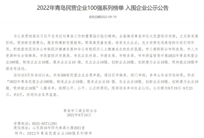 自今年5月份起,市工商聯(lián)聯(lián)合市科技局、市人力資源和社會保障局、市民營經(jīng)濟發(fā)展局、市農(nóng)業(yè)農(nóng)村局、市商務局、市稅務局、市市場監(jiān)管局開展2022年青島民營企業(yè)100強、制造業(yè)企業(yè)10強、服務業(yè)企業(yè)10強、農(nóng)業(yè)企業(yè)10強、創(chuàng)新企業(yè)10強、創(chuàng)新潛力企業(yè)10強、吸納就業(yè)10強申報發(fā)布活動。